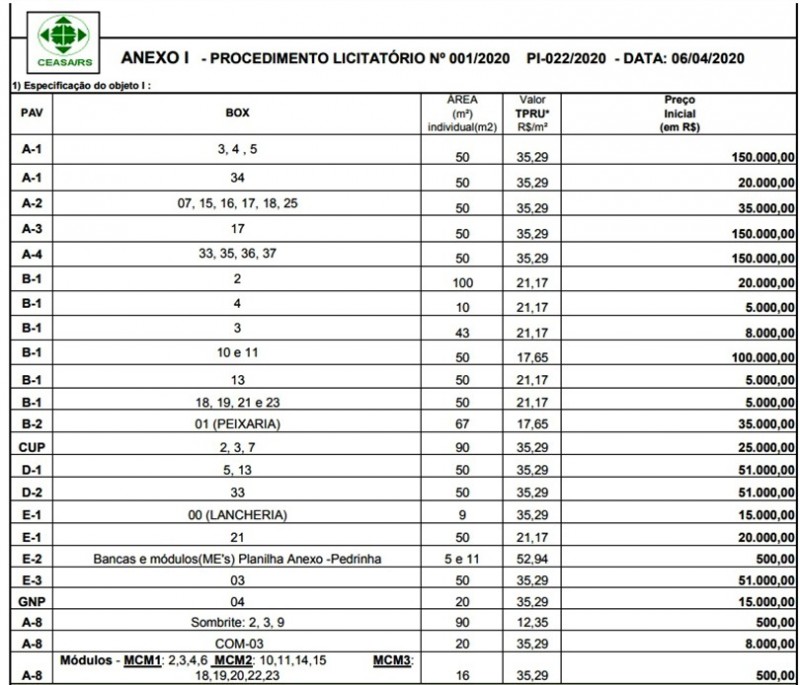 No dia 6 de abril, a Ceasa (Centrais de Abastecimento do Rio Grande do Sul), vinculada à Secretaria da Agricultura, Pecuária e Desenvolvimento Rural, realizará licitação para venda de 55 espaços em 14 setores do complexo (veja tabela abaixo). Pelo menos uma área é destinada para lancheria e outra para peixaria. Os demais espaços são para lojas (boxes) e módulos. Os vencedores serão aqueles que fizerem as maiores ofertas. A documentação será recebida pela Comissão Especial de Licitação até às 10h do dia 6 de abril no auditório da Ceasa. Para ver o regulamento acesse aqui o link e clique em “Procedimento Licitatório Boxes — nº 001/2020”.