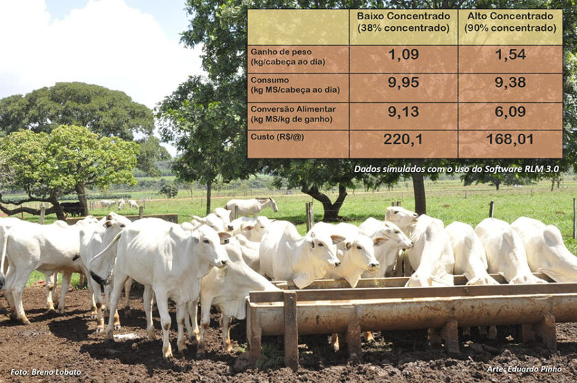 Outro estímulo para adoção de altas concentrações de grãos ocorre pela necessidade menor de área para produção de volumoso e custo operacional reduzido ao lidar com a distribuição nos cochos de menores volumes de alimentos. O produtor Marco Antonio Balsalobre confina cerca de 500 animais ao ano e pretende aumentar para 1000 em até dois anos. Sua propriedade está localizada em São Carlos (SP). Ele utiliza dieta de alto concentrado, com apenas 8% de volumoso.