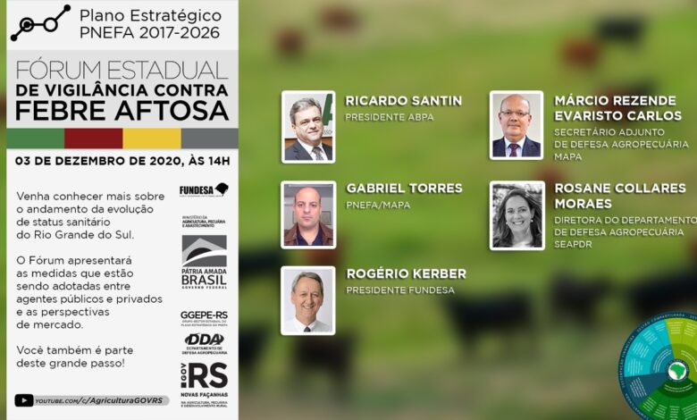 O “Fórum Estadual de Vigilância contra a Febre Aftosa”ocorrerá no dia 3 de dezembro, às 14h. O evento online será transmitido ao vivo no Youtube e Facebook da Secretaria da Agricultura, Pecuária e Desenvolvimento Rural. O objetivo do evento é mostrar as medidas que estão sendo adotadas para alcançar o reconhecimento da Organização Mundial de Saúde Animal como área livre de febre aftosa sem vacinação e as perspectivas de mercado para o setor produtivo da carne.
