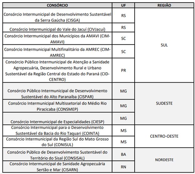 O projeto recebeu 55 inscrições, passando para fase de entrevistas 40 consórcios públicos intermunicipais. Na avaliação final, foram selecionados 12 consórcios abrangendo as regiões Sul, Sudeste, Centro-Oeste e Nordeste, que receberão apoio direto da equipe do Mapa para adesão ao Sistema Brasileiro de Inspeção de Produtos de Origem Animal (Sisbi).