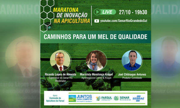 Mirando no grande potencial e aumento da profissionalização do setor apícola, o Programa Juntos para Competir, parceria entre Farsul, Senar-RS e Sebrae/RS, realiza a Maratona de Inovação na Apicultura, uma série de eventos para discutir importantes temas do setor. A segunda atividade será uma live com foco na qualidade do produto e os caminhos que os produtores e o setor devem percorrer para atingir seus objetivos.