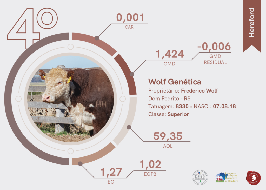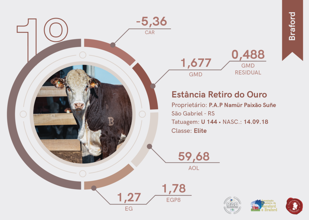 A 16º edição da PAC Hereford foi vencida pela Estância Santa Tereza, de Camaquã (RS). O animal apresentou um ganho médio diário (GMD) de 1,146 Kg. Já na 25ª edição da raça Braford o destaque foi para a Estância São Bento, de Livramento (RS), fechando a prova com um GMD de 1,203 kg.