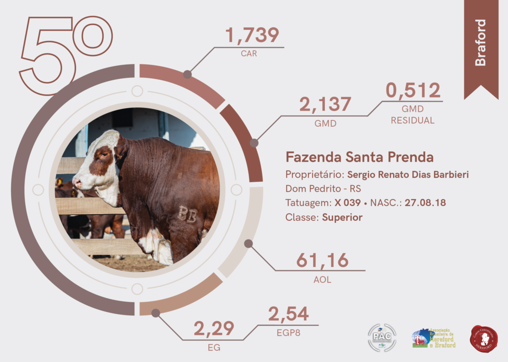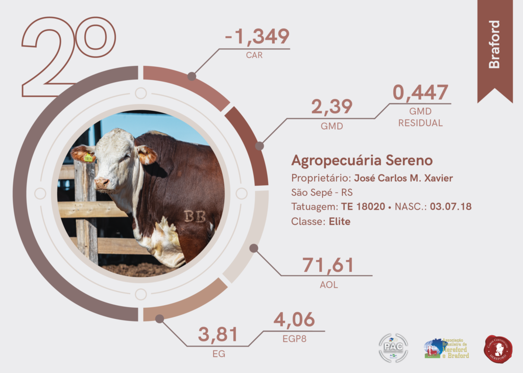 De São Sepé, mais precisamente da Agropecuária Sereno o segundo lugar da raça Braford. O terceiro lugar foi para a Estância Santa Gertrudes, localizada em Santana do Livramento.