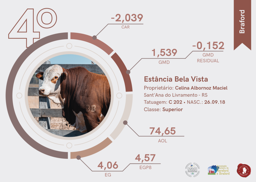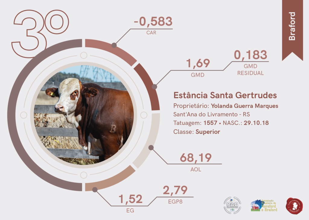 Na segunda colocação da raça Braford ficou a Cabanha Santa Camila, de Uruguaiana (RS). O terceiro lugar da raça foi para a Estância Santa Gertrudes, de Santana do Livramento (RS).
