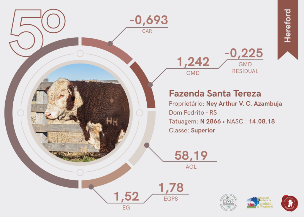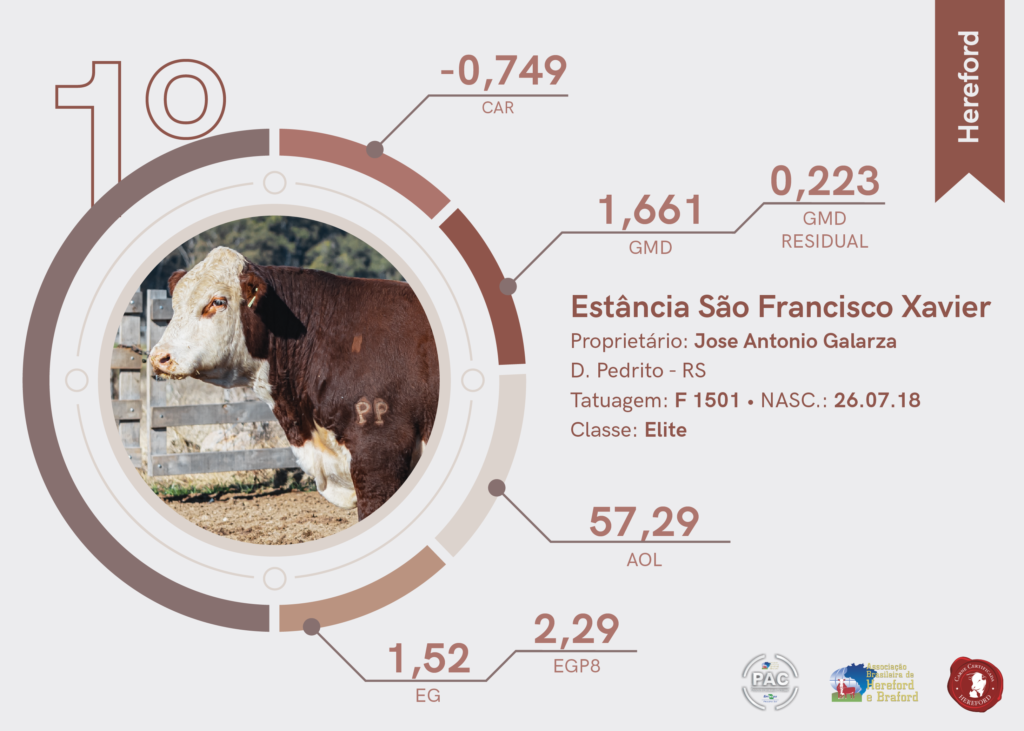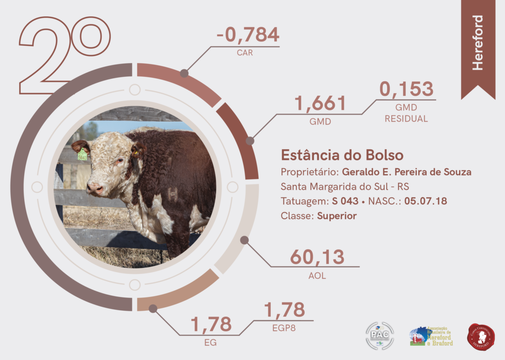 A segunda colocação na raça Hereford foi para a Estância do Bolso, localizada em Santa Margarida do Sul. Já a terceira colocação da raça também foi para a Estância São Francisco Xavier, de Dom Pedrito.