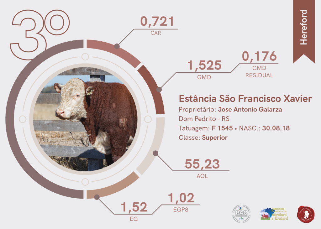 A segunda colocação na raça Hereford foi para a Estância São Francisco Xavier, de Dom Pedrito (RS). Já o terceiro lugar na raça foi para a Estância Santa Tereza, de Camaquã (RS).