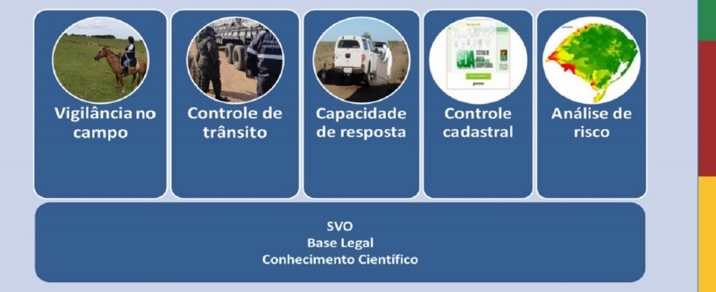 Entre as ações já atendidas estão: metas de vigilância, padronização no cumprimento da legislação, incremento na fiscalização de eventos com aglomeração de animais, cumprimento de metas dos programas de sanidade animal, atividades de educação em saúde animal e maior participação do serviço veterinário oficial nas ações do SUS. E também ações que se referem ao controle do saldo eletrônico de aves, adequação de legislação para trânsito de equinos e cumprimento de normas federais para vacinação compulsória em propriedades com focos de raiva.