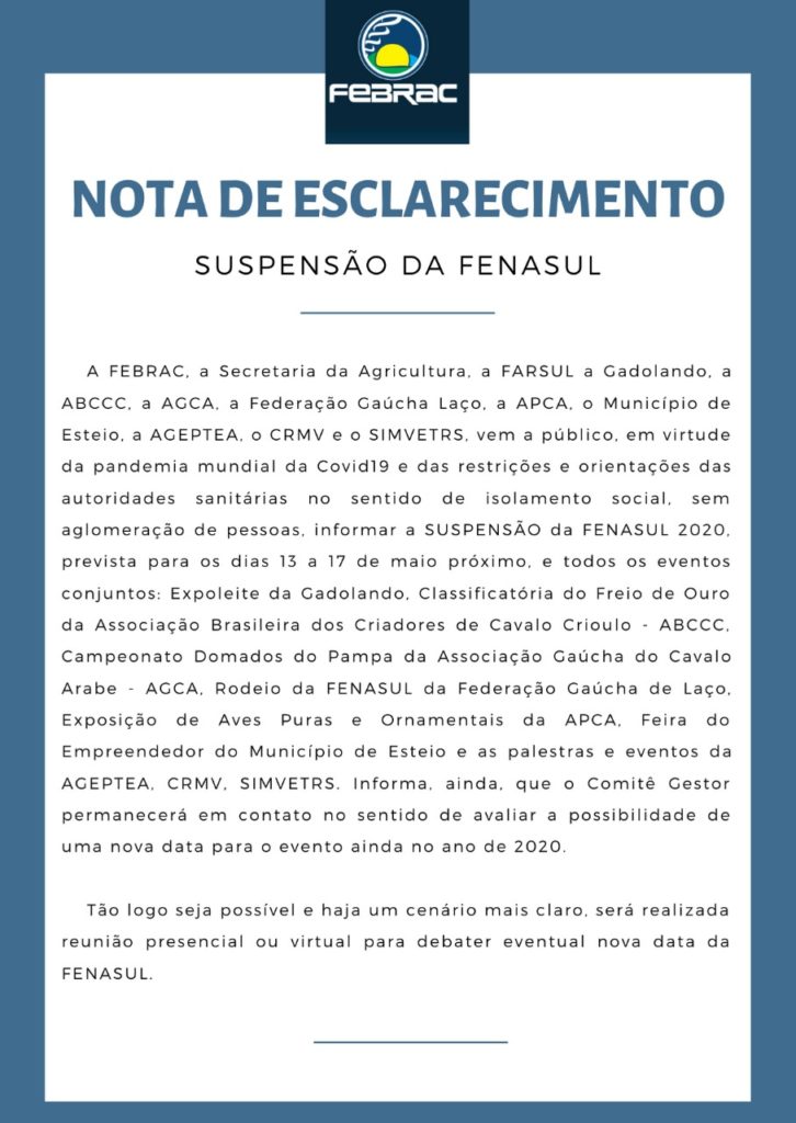A FEBRAC, a Secretaria da Agricultura, a FARSUL, a Gadolando, a ABCCC, a AGCA, a Federação Gaúcha de Laço, a APCA, o Município de Esteio, a AGPTEA, o CRMV, e o SIMVETRS, vem a público, em virtude da pandemia mundia da Covid19 e das restrições e orientações das autoridades sanitárias no sentido de isolamento social, sem aglomeração de pessoas, informar a SUSPENSÃO da FENASUL 2020, prevista para os dias 13 a 17 de maio, e todos os eventos conjuntos: Expoleite da Gadolando, Cassificatória do Freio de Ouro da Associação Brasileira dos Criadores de Cavalo Crioulo – ABCCC, Campeonato Domados do Pampa da Associação Gaúcha do Cavalo Arabe – AGCA, Rodeio da FENASUL da Feredação Gaúcha de Laço, Exposição de Aves Puras e Ornamentais da APCA, Feira do Empreendedor do Município de Esteio e as palestras e eventos da AGEPTEA, CRMV, SIMVETRS, informa, ainda, que o Comitê Gestor permanecerá em ocntato no sentido de avaliar a possibilidade de uma nova data para o evento ainda no ano de 2020.