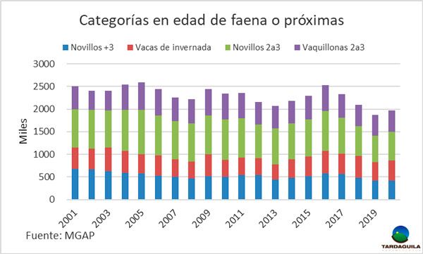 Los cambios relevantes son el incremento de la cantidad de terneros, que muy posiblemente haya superado la barrera de los 3 millones, así como el aumento de los novillos de sobreaño y las vacas de invernada. El rodeo de cría habría tenido un crecimiento algo menos pronunciado. Asimismo, se proyecta un stock de novillos de más de 3 años sin cambios significativos respecto a 2019.