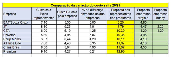 Obs.: A formação da proposta da representação dos produtores foi constituída pela média do custo de produção apurado pela representação dos produtores com a apurada por cada empresa, mais o percentual de diferença entre as tabelas praticadas por cada empresa.