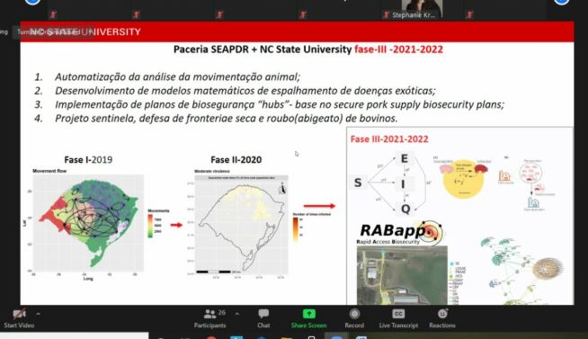 A afirmação ocorreu durante reunião virtual, nesta terça (19), que marcou o início oficial do trabalho da segunda fase do convênio do Fundo de Desenvolvimento e Defesa Sanitária Animal do RS com a Universidade da Carolina do Norte (NCSU), o Ministério e a Secretaria da Agricultura. O professor Gustavo Machado, da NCSU, apresentou as temáticas que serão abordadas nesta etapa: a automatização da análise de movimentação animal, o desenvolvimento de modelos matemáticos de espalhamento de doenças exóticas, a implementação de planos de biossegurança nas propriedades com maior número de conexões e o apoio ao Programa Sentinela sobre trânsito de animais e abigeato na fronteira.