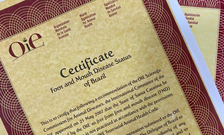 O Brasil possui mais seis estados reconhecidos pela Organização Mundial de Saúde Animal (OIE) como área livre de febre aftosa sem vacinação. Santa Catarina, pioneiro nesse processo e já certificado há 14 anos, comemora a conquista do Paraná, Rio Grande do Sul, Acre, Rondônia e partes do Amazonas e do Mato Grosso.