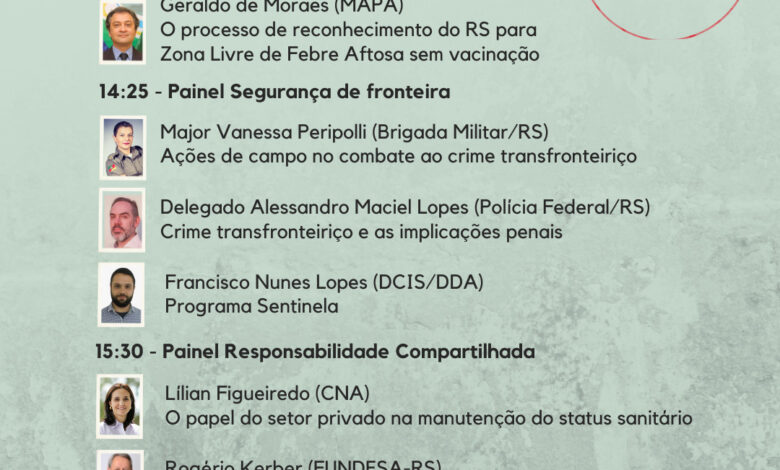 Os crimes transfronteiriços e a vigilância nas regiões de fronteira também estarão na pauta, com a palestra de especialistas da Brigada Militar, da Polícia Federal e da coordenação do Programa Sentinela. A responsabilidade do produtor será tema de palestra de representante da Confederação da Agricultura e Pecuária do Brasil e o papel do Fundesa na Emergência Sanitária será abordado pelo presidente Kerber.