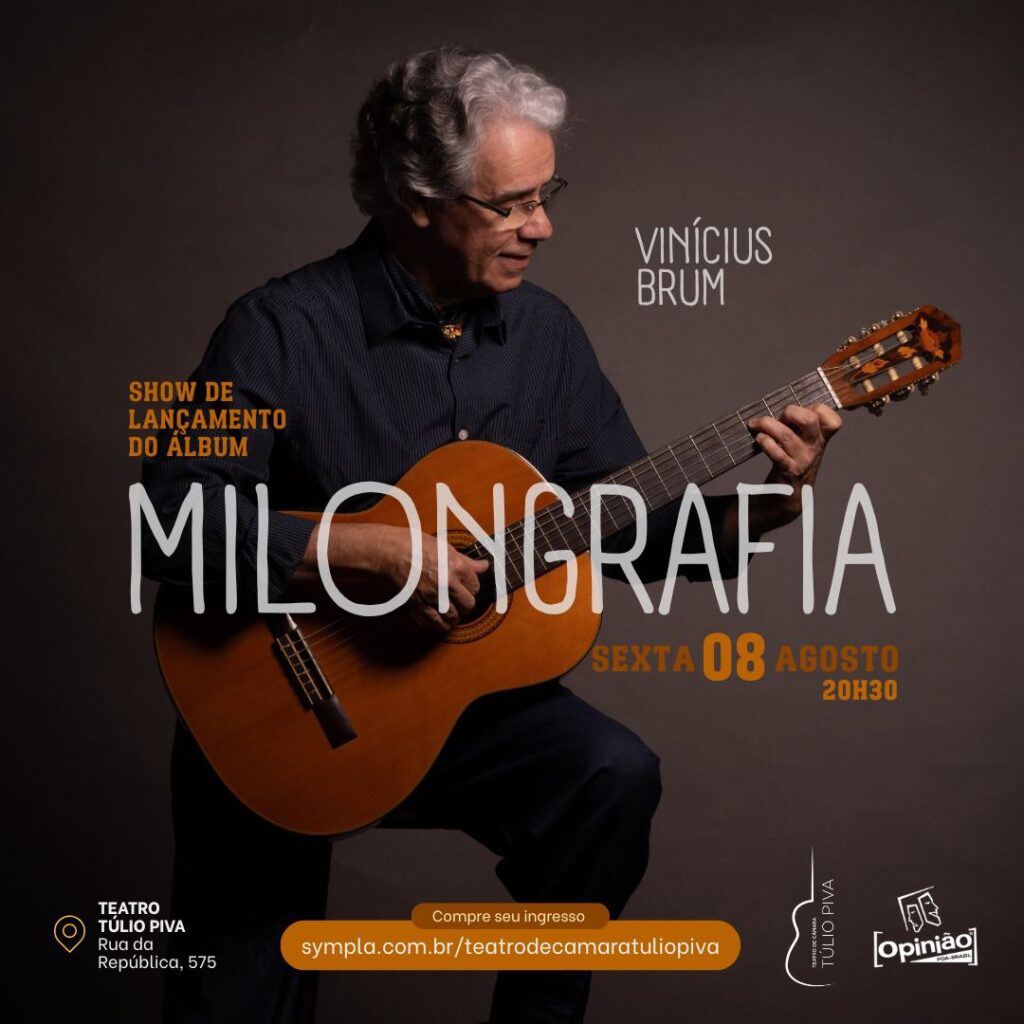 O cantor e cancionista Vinícius Brum apresenta no dia 8 de agosto de 2025, no Teatro Túlio Piva, em Porto Alegre, o show de lançamento de seu novo álbum, Milongrafia. O sexto disco solo de sua trajetória, já disponível nas plataformas digitais desde abril, é uma imersão profunda no universo da milonga, gênero que Brum domina com rara autenticidade e sensibilidade. Com letras que transitam entre o amor, a ausência, a saudade e inquietações existenciais, Milongrafia é um trabalho maduro, poético e profundamente conectado à alma do artista e à tradição da canção regional gaúcha. Ingressos pelo link: https://www.sympla.com.br/teatrodecamaratuliopiva