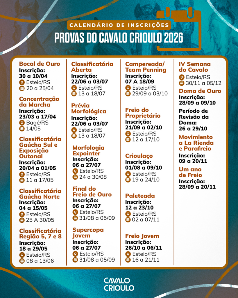 Seguindo o compromisso com Sócios, Criadores, Expositores e Público em geral que prestigia as provas oficiais da Raça Crioula, a Associação Brasileira de Criadores de Cavalos Crioulos, a ABCCC, trabalha com a brevidade e planejamento de todo seu ciclo. Comprovando esse quesito, o Setor de Prova divulgou e reforçou os períodos de Inscrições do Calendário Ciclo 2026. Nele contém período para inscrever-se e também as datas oficiais das das semifinais seletivas funcionais (Classificatórias ao Freio de Ouro), Finais Oficiais do Tripé Seletivo da Raça (Morfologia e Freio de Ouro, que acontecem na Expointer e também da Marcha Anual de Resistência), além das Finais da Esportivas e Semana do Cavalo Maneca Costa.
