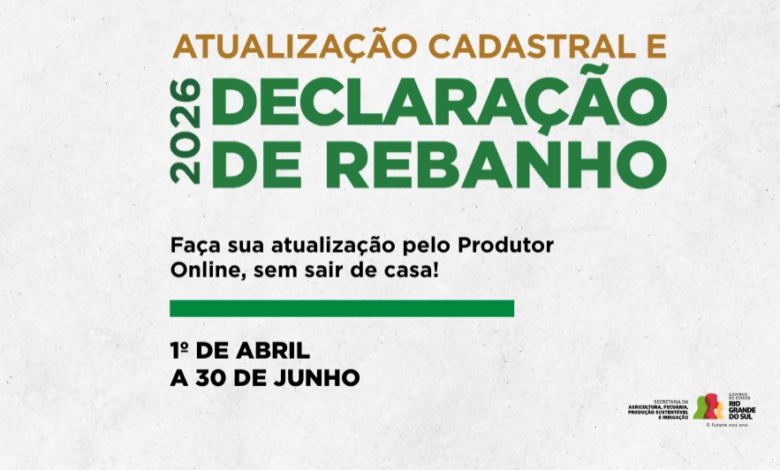 Começa nesta quarta-feira (1º/4) o período para a Declaração Anual de Rebanho e atualização cadastral referente ao ano de 2026. O prazo se encerrará em 30 de junho. A Declaração de Rebanho é uma obrigação sanitária de todos os produtores rurais gaúchos detentores de animais.
